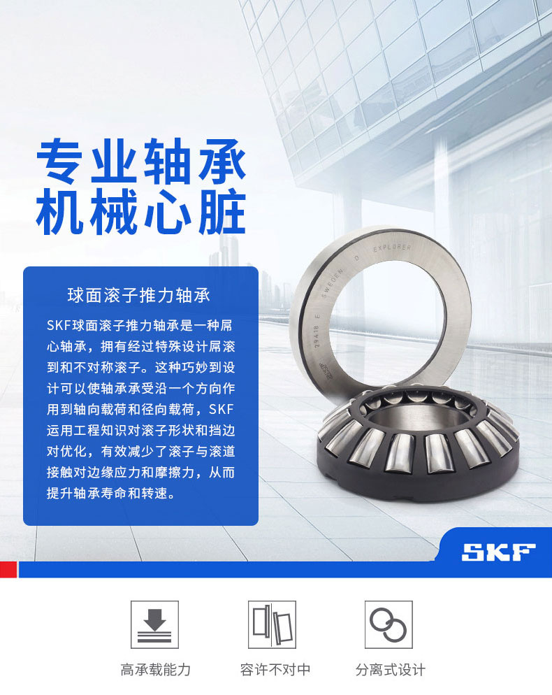 推力滚子轴承是用于承受轴向载荷为主的轴、径向联合载荷,但径向载荷不得超过轴向载荷的 55% 。与其他推力滚子轴承相比,此种轴承摩擦因数较低,转速较高,并具有调心性能。